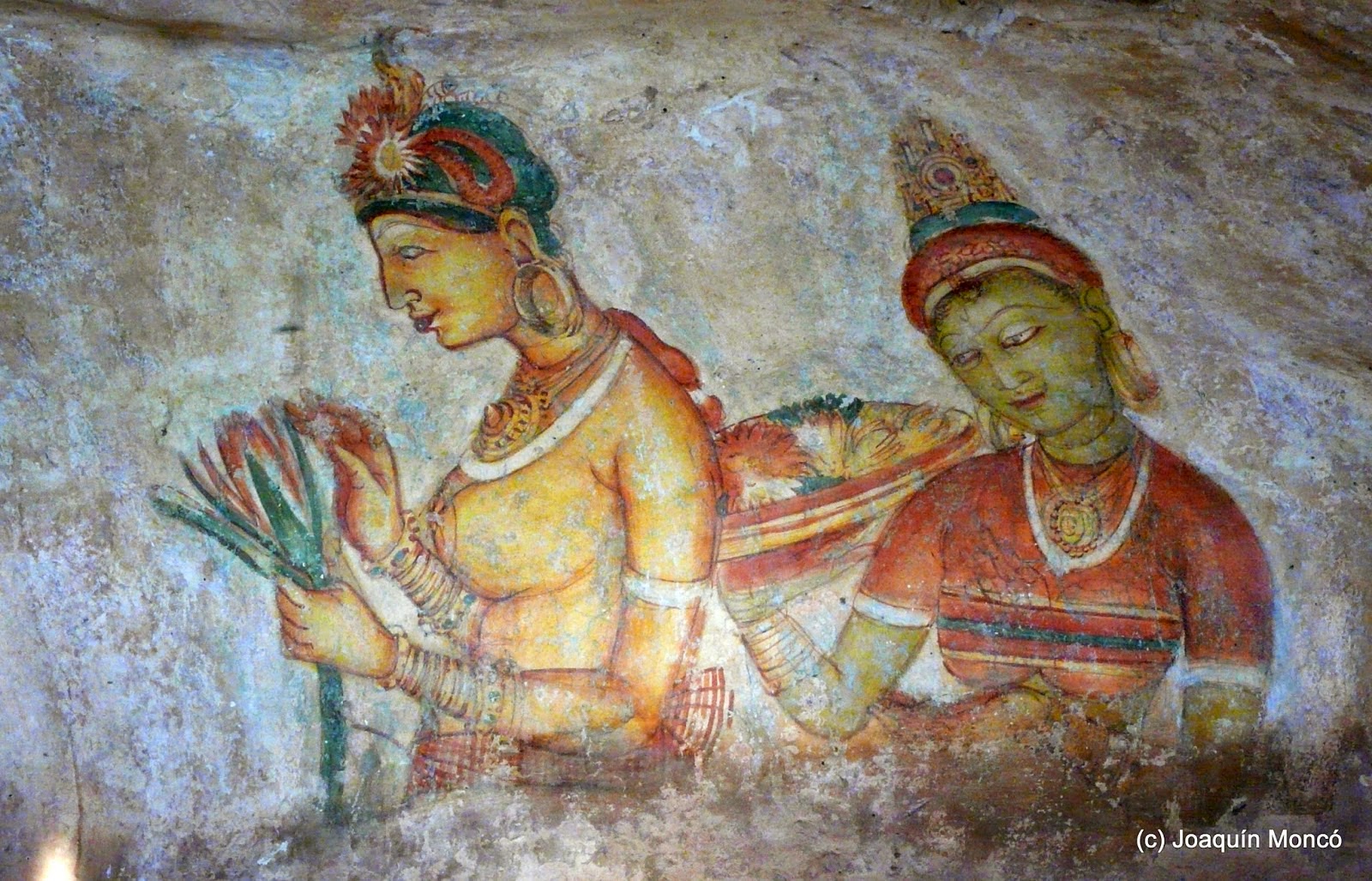 El tuc tuc nos ha dejado donde se encuentran las taquillas. Allí esperan unos cuantos locales intentando venderse como guías. Hemos comprado las entradas y hemos entrado por nuestra cuenta. El ir acercando a la roca paseando poco a poco atravesando los jardines reales rodeados de estanques que rodean la roca a primera hora de una mañana lluviosa y con poquísima cantidad de turistas,ha hecho que sea uno de los mejores momentos del viaje. Al final de los grandes jardines, empieza la subida, empezando con unas escaleras de ladrillo que van ascendiendo de terraza en terraza pasando por debajo de grandes rocas. Más tarde se entra en un gran corredor que nos lleva a unas escaleras de caracol suspendidas en la roca que te lleva a la galería donde se encuentran los frescos de las damas de Sigiriya. Estos frescos datan del siglo V y se cree que representan a ninfas celestiales, concubinas del rey Kassapa o representaciones de la diosa Tara, una de las figuras más importantes del budismo tántrico. Se encuentran en muy buen estado y resulta impresionante imaginarse el momento en que fueron pintadas suspendidas en una pared prácticamente vertical con un montón de metros bajo los pies.
